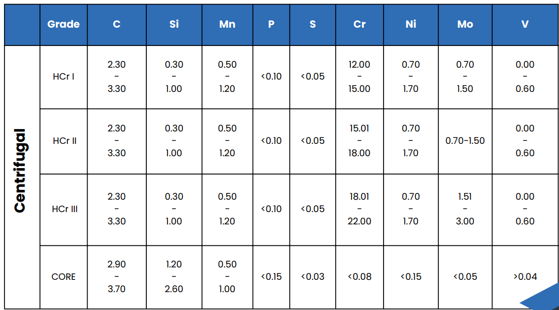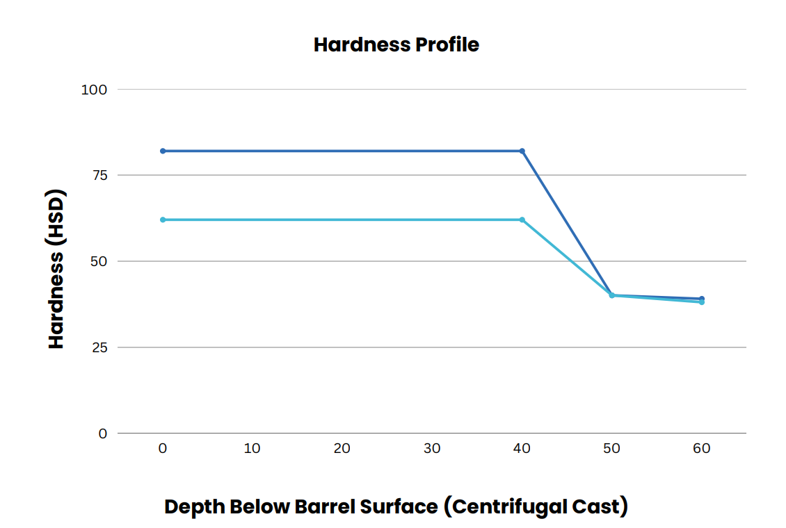 We make this type of rolls by centrifugal cast double poured. In this case, we can achieve an excellent wear resistance in the shell with flake graphite, bainite & martensite and primary carbide type M7C3 + secondary carbide in the microstructure. Besides the excellent wear resistance, it is also good against fire cracking thanks to the oxide film Cr2O3 formed on the body surface while rolling. At the same time, the core is strong enough to assure the roll can work safely.