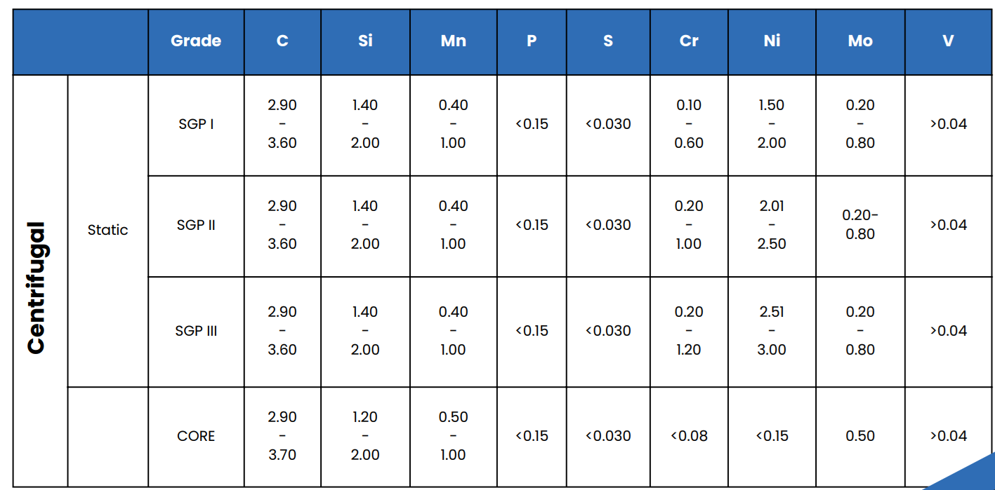 SGP rolls are widely used in the roughing stands and intermediate stands of various rolling mills. Usually, we make this type of roll by static cast and centrifugal cast. We recommend using centrifugal cast rolls for better performance when the groove in the roll body is not too deep. With more alloy added in, we can get a microstructure consisting of spherical graphite, pearlite and primary carbide type M3C up to 30%. Meanwhile, the core of the roll still keeps very strong with a great amount of spheroidal graphite in the matrix of femite. When the groove in the roll body is very deep, we recommend using rolls static cast with groove to achieve a low hardness drop between the body surface and bottom of the groove.