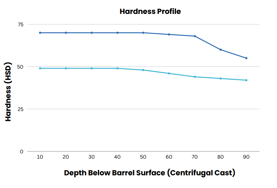 Rolls of this type which are alloyed with Chromium to achieve deeper penetration of carbides belongs to pearlitinc nodular iron rolls. This kind of rolls has a lower hardnessdrop than the standard nodular iron rolls which result in better wear resistance, espcially for rolls with deep grooves.